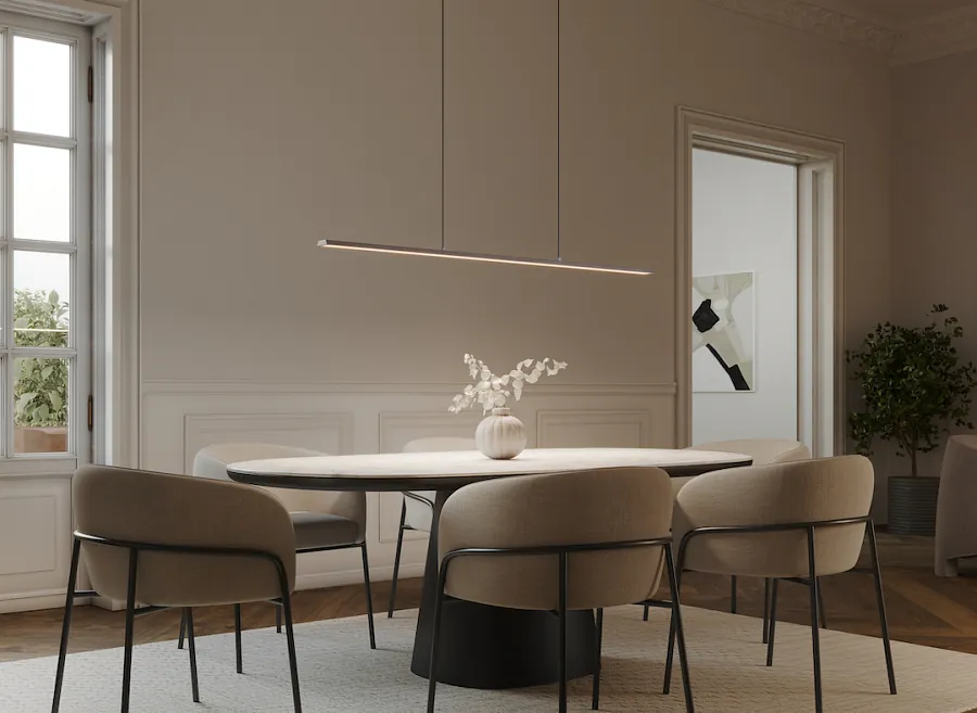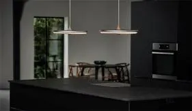 SLIM er en elegant, diskret og effektiv lyskilde, der er ideel til brug over køkkenøen, spise- eller mødeborde. Den kaster effektivt et blødt, varmt og diffust lys over bordet.