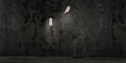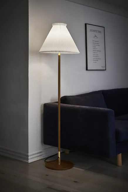 Gulvlampen er udført i egetræ med messingdetaljer og tager afsæt i den klassiske Le Klint lampe med en plisseret skærm. Med en sofistikeret konstruktion er lampen enkel men med et lille tvist ved foden. Standeren sidder fast ved hjælp af en elegant messingdetalje, som gør, at designet har et stærkt nutidigt udtryk. Leveres i lys eller røget eg – naturligvis med en håndfoldet lampeskærm.
